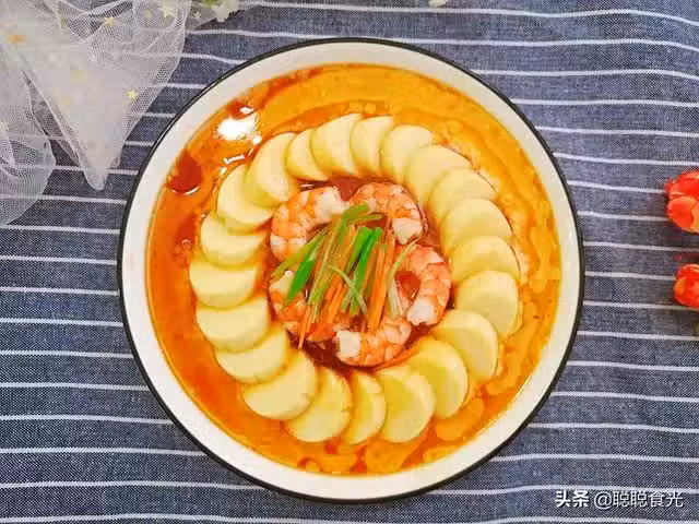 5、蒸到蝦仁變色後,取出來,在中間放蔥絲和胡蘿蔔絲,淋點蒸魚豉油,最後燒點熱油澆在蔥絲上爆出香味就好了。