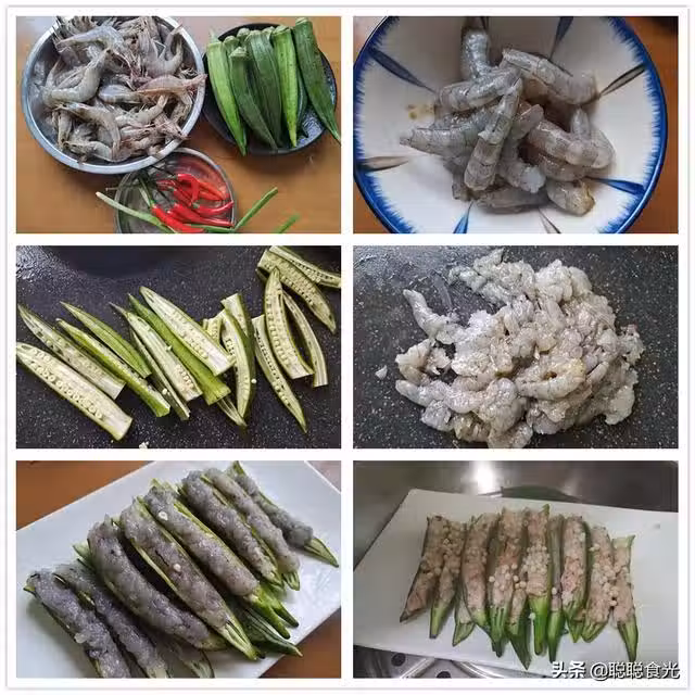 4、把蝦泥塞進秋葵中,把秋葵籽擺在上面裝飾一下,整齊地擺入盤中。