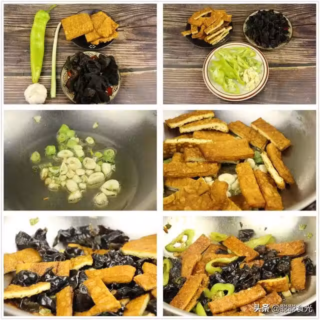 1、木耳提前一小時泡發,豆乾提前切成長條,青椒,蔥蒜也切成段放入盤中備用。