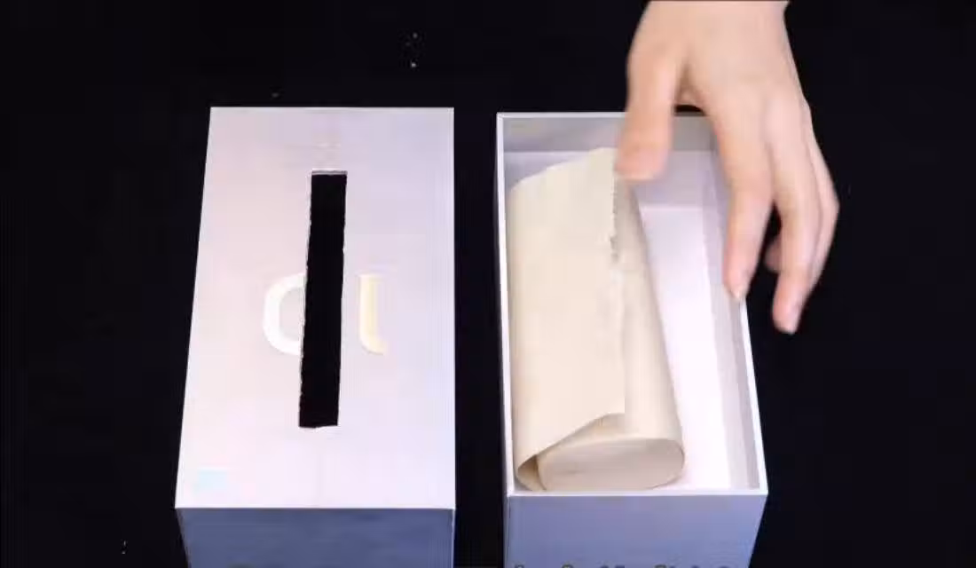 在手機盒的蓋子上切下一個窄長條,裡面放上抽紙或者是捲紙,一個方便又美觀的紙巾盒就誕生了。