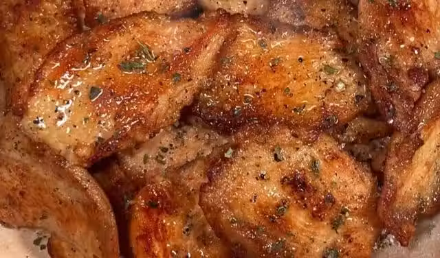 2、鍋內刷少許油,放入腌好的雞胸肉煎至兩面焦黃即可~記得撒上椒鹽黑胡椒碎哦!