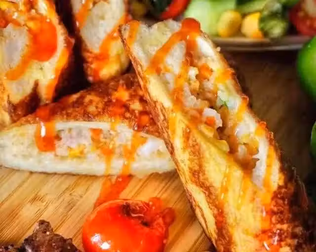 將拌好的蝦仁放在吐司的另外一邊,像卷壽司一樣將吐司捲起來。