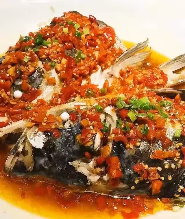 步驟5. 魚頭上放炒好的剁椒醬大火蒸10分鐘。