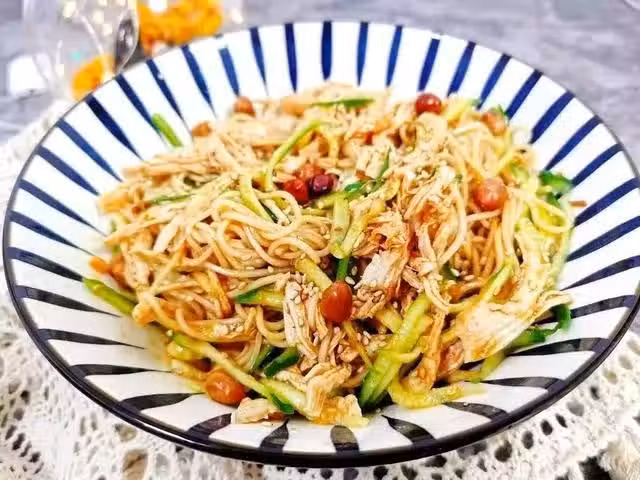 面過冷水,瀝干水分,撈出,盛盤,上面擺放豆芽、胡蘿蔔絲、黃瓜絲、雞肉絲、頂層撒蔥花和腰果碎。