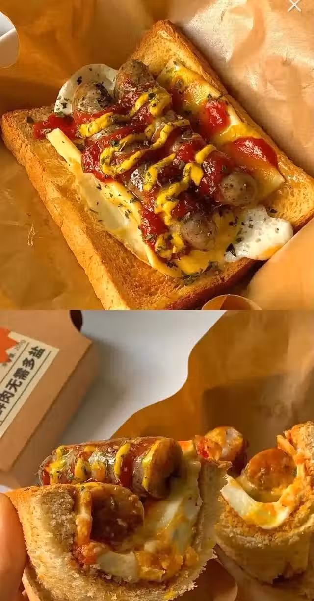 (3)吐司片上鋪上煎蛋芝士片肉腸