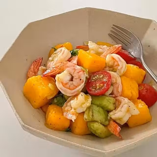 3:盆中放入牛油果芒果聖女果 蝦仁和調好的醬汁攪拌均勻