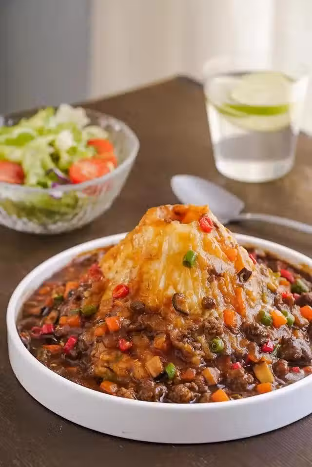 5、澆頭均勻淋在土豆山上,火山土豆泥完成。