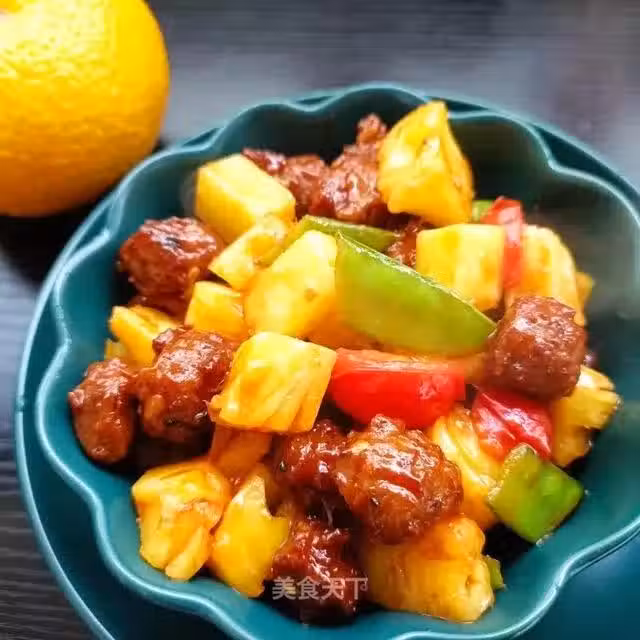 8、放番茄和菠蘿翻炒,讓水果均勻裹滿湯汁。