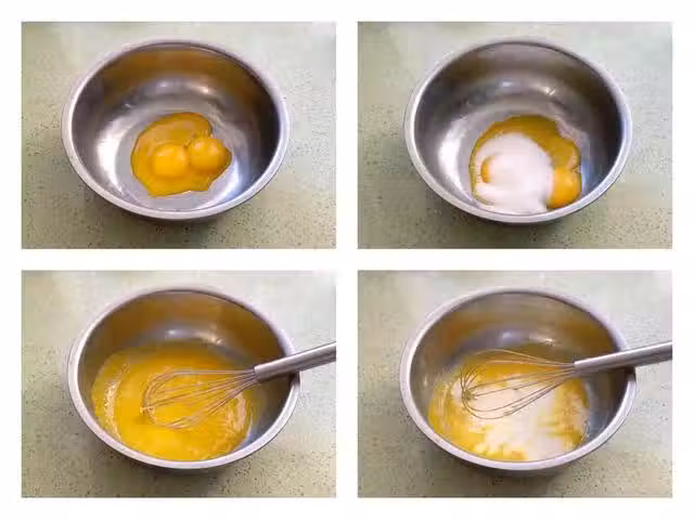 2、將牛奶攪拌均勻之後,接著加入鹽和玉米油混合攪拌均勻,將提前過篩後的粉類倒入蛋黃液中,使用Z字型手法攪拌至蛋黃糊順滑無顆粒,這樣蛋黃糊部分就製作好了。