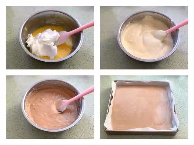 5、蛋糕在烘烤的時候,來準備奶油餡,將100毫升的奶油倒入無油無水的容器中,將咖啡粉和可可粉用少許的溫水化開涼涼,然後倒入奶油中,用打蛋器打至奶油細膩光滑即可。蛋糕烤好後迅速取出來撕去油紙,晾涼後放在另一張油紙上,將蛋糕毛巾面朝下,上面均勻地抹上奶油,利用擀麵杖將蛋糕捲起來,放入冰箱內冷藏定型,定型1小時後取出來切片即可食用。