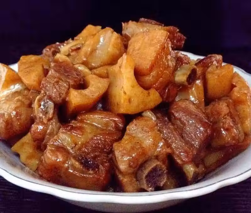 排骨500公克、蓮藕兩小節、蔥段,薑片,冰糖各適量、醬油10ml、料酒10ml+10ml、鹽6克、十三香1克