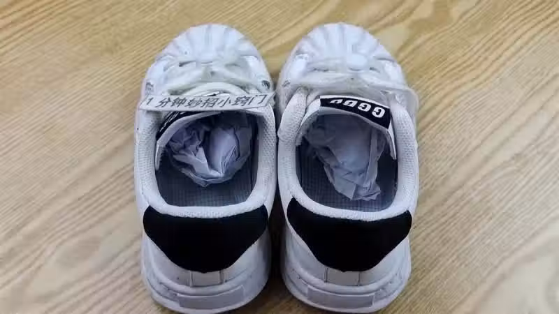 像平時,我們就可以把這兩團紙,塞進平時不穿的鞋子裡面,用來當作鞋撐來使用,防止鞋子擠壓變形。家裡鞋櫃裡面的鞋子擺放得比較多,而一些換季的鞋子,清洗乾淨了之後,我們都會把它們放在鞋櫃裡面收納,如果鞋子放得多了,就很容易會受到擠壓,變形,我們就可以利用這兩團紙,來支撐鞋子。