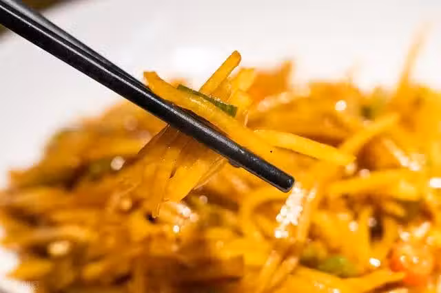 5. 倒進土豆絲,快速翻炒。沿鍋邊倒入白醋,醋遇熱大部分酸味揮發,留下醋香。加食鹽和白糖調味。