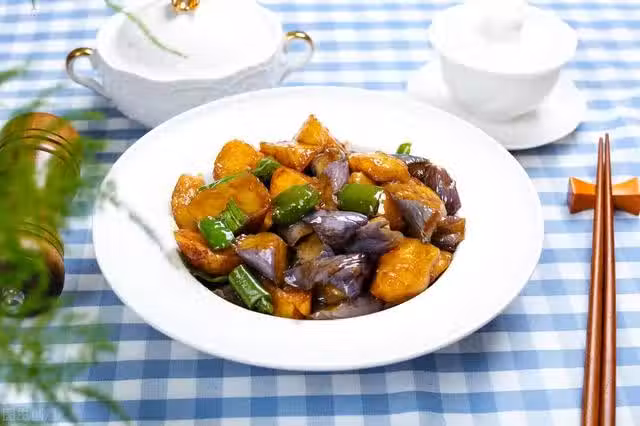 1. 土豆洗凈切片,茄子洗凈切塊,青椒洗凈切片,蔥切蔥花,姜切末備用。將切塊的土豆、茄子浸泡在水裡5分鐘,撈出瀝干水。