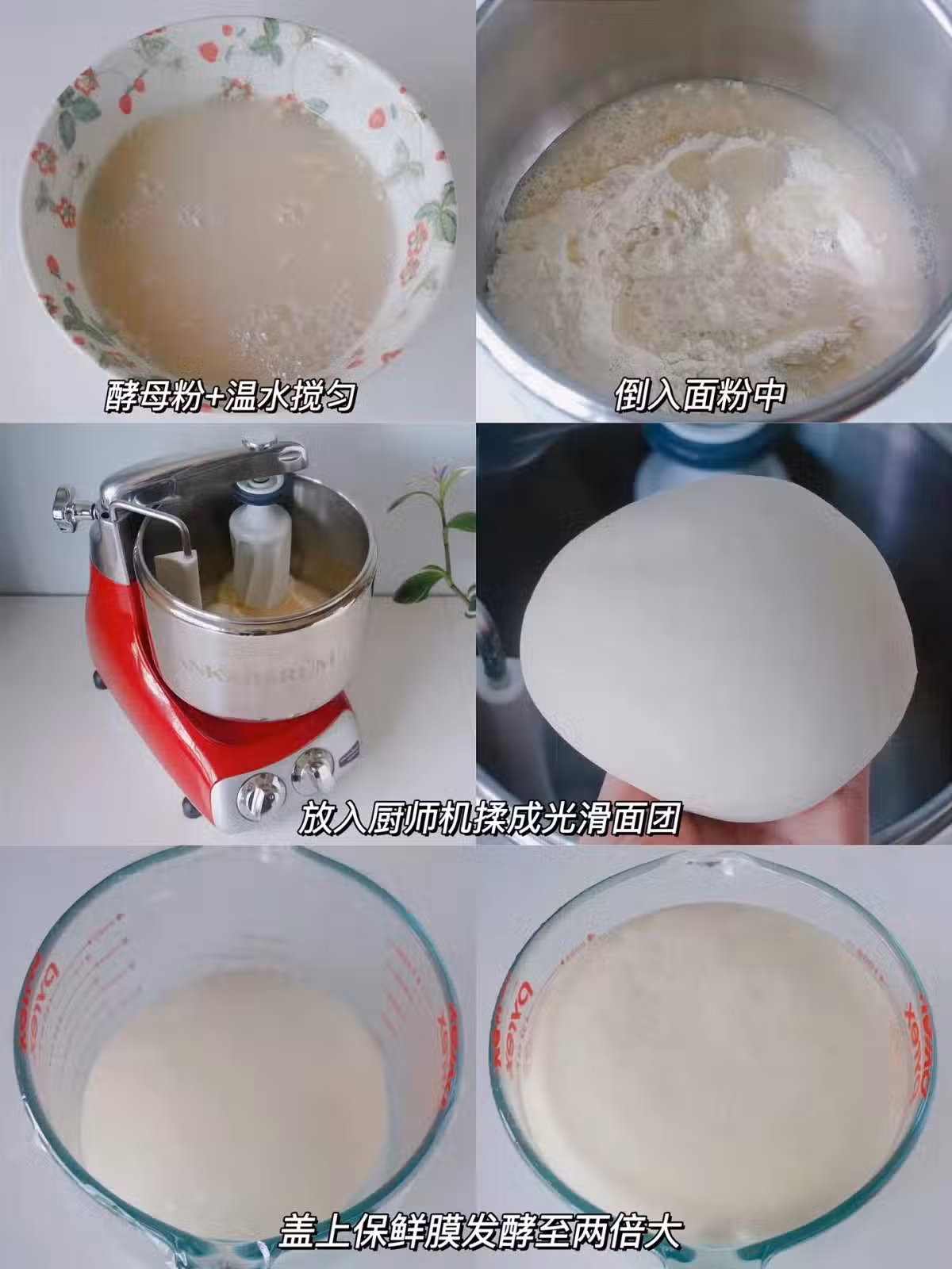 1️⃣酵母➕溫水混合攪勻,廚師機桶中放入麵粉➕酵母水,揉成光滑麵糰,蓋上保鮮膜放溫暖處發至2倍大
