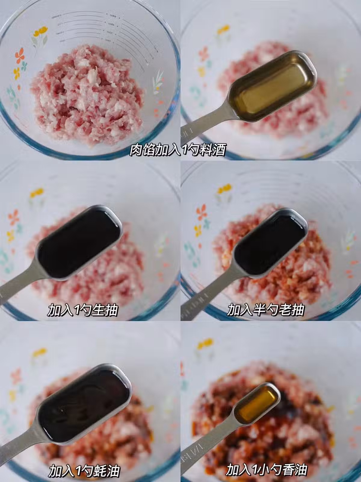 2️⃣肉餡➕料酒➕生抽➕老抽➕蚝油➕香油攪勻