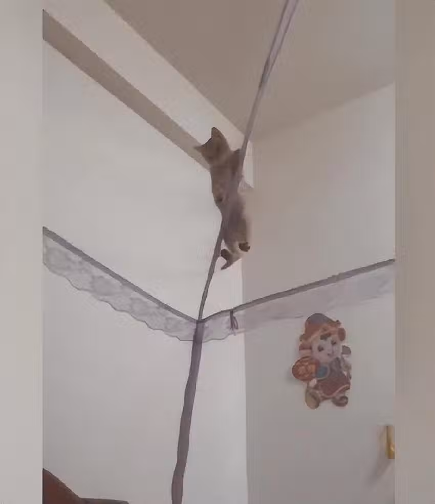 只見小貓宛如一個巨大的蜘蛛一樣,縮在蚊帳的頂端,它甚至還把蚊帳給扒開了一個大洞,方便更清楚的觀摩自己。