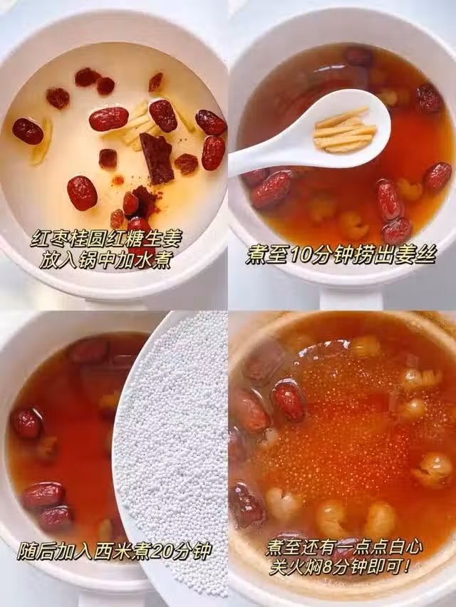 食材:西米、黑糖/紅糖、紅棗、生薑、桂圓、牛奶。