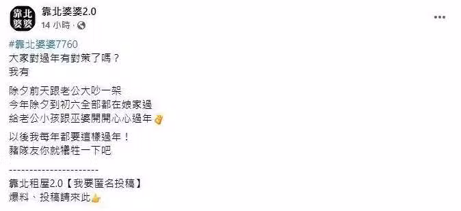 根據ETtoday報導,過去有人妻在臉書社團「靠北婆婆2.0」匿名發文,「大家對過年有對策了嗎?