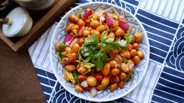 1.將洋蔥,香菜和青椒洗凈控水,切成花生差不多大的小丁,和冷卻的花生放在一個沙拉盆里。