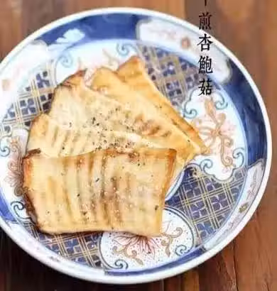 2、平底鍋燒熱,下1大匙橄欖油,將切好的杏鮑菇擺入鍋中,煎至邊緣微微發黃翹起,翻面煎另一面,此時可均勻撒上鹽和一點點黑胡椒粉調味,煎至表面金黃邊緣微焦即可