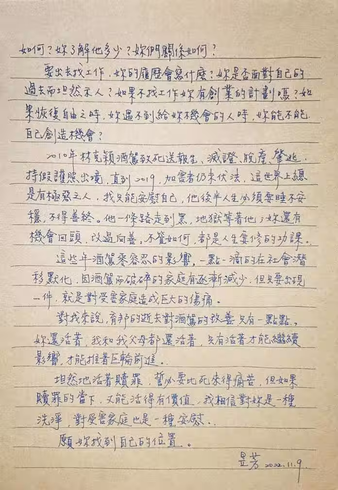 給予鼓勵之後,陳昱芳寫道:「坦然的活著贖罪,絕對比走了還痛苦,但如果贖罪時能夠活得有價值,不但對自己是種洗淨,對受害者家屬也是種安慰。