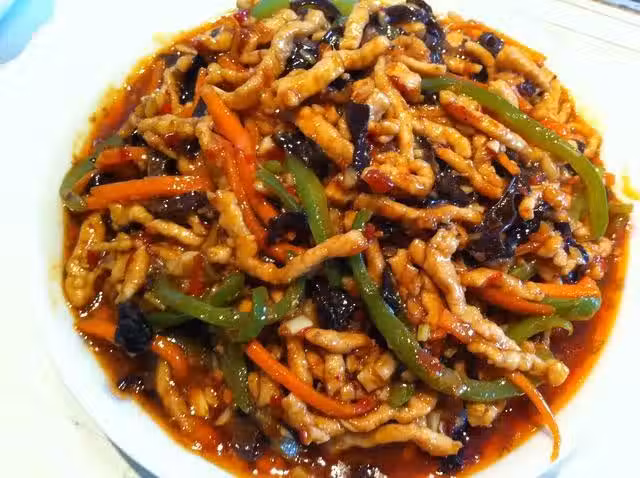 4.鍋中加油,油熱後,放肉絲煸炒,滑散後放入泡辣椒,炒熟後放入薑末、蒜末翻炒均勻。
