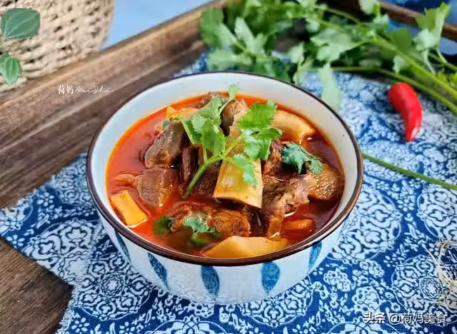 起鍋倒油,放入生薑、牛肉煸炒幾分鐘,放入干辣椒、花椒、八角、桂皮和沙姜、陳皮,小茴香等一起炒香,再放入辣椒粉炒勻,炒出香辣味,加豆瓣醬,炒出紅油色,放入切好的筍子翻炒均勻。