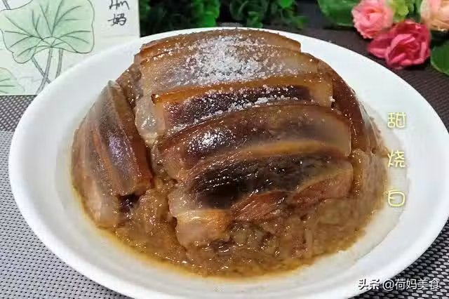 肉塊切夾刀片,抺上紅豆沙,將夾好豆沙的肉片碼放在碗中,肉皮朝下,放入拌好紅糖的糯米飯,放入蒸鍋中蒸40分鐘,取出撒上白糖即可。