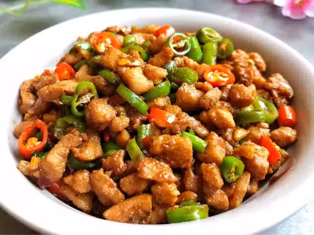 4:加入少許雞精和五香粉,這時候雞肉已經熟了,再把辣椒放進去炒勻即可。