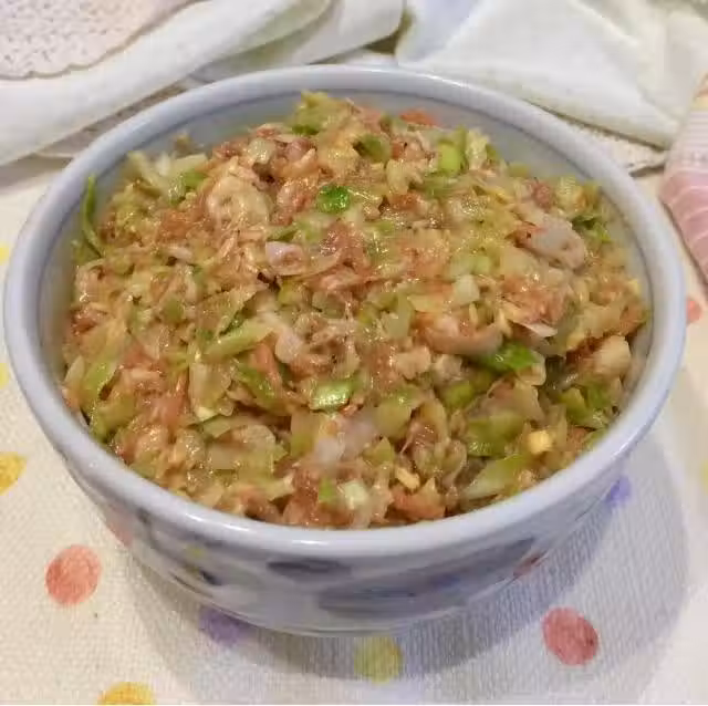 3.大蔥切碎,胡蘿蔔擦短絲切幾刀成粒,擠掉水份的圓白菜,蝦皮,加鹽、色拉油拌勻放制5分鐘(拌油是封住蔬菜水份)。