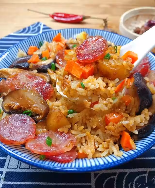 1.所有食材洗凈後,臘腸切片,土豆切丁,胡蘿蔔切丁,香菇提前泡好切片。