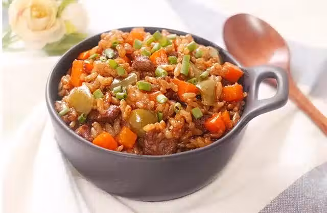 5.盛起,放入電飯鍋,加入和材料持平的水,開啟電飯鍋煮飯程序,煮飯程序結束,香噴噴、超美味的肉末雙豆燜飯就完成了!