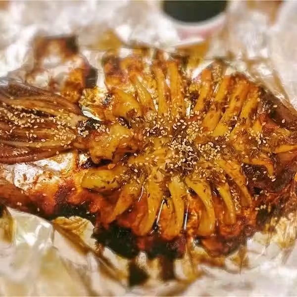4.烤盤放錫紙,放上魷魚,刷上油。放入烤箱220度15分鐘