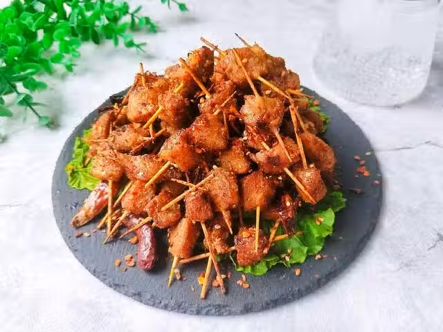 1.把肉洗乾淨切成小塊放入盤中。加入生抽,料酒,白糖,蚝油,澱粉,少量辣椒粉,花椒粉,孜然粉,鹽攪拌均勻腌制1-2小時。