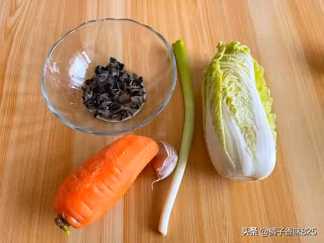 1、準備食材,切蒜末和蔥花,胡蘿蔔切片、木耳泡發後洗凈,娃娃菜斜刀切成片。