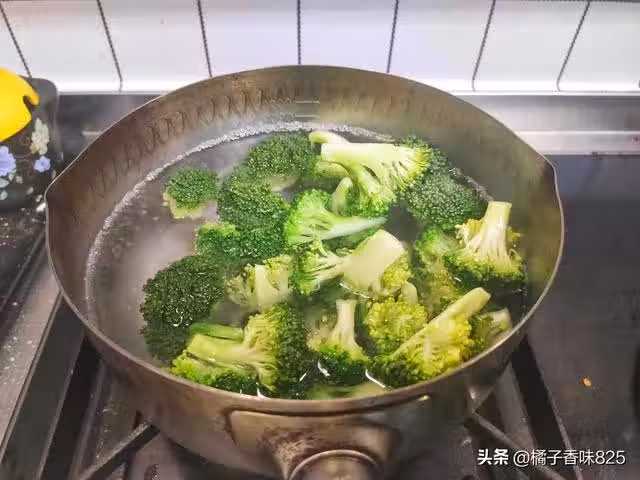 4、再用煮西蘭花的水,把香菇片煮一下,如果香菇切得比較厚,可以再煮兩分鐘,撈出放入涼水中備用。。。。。