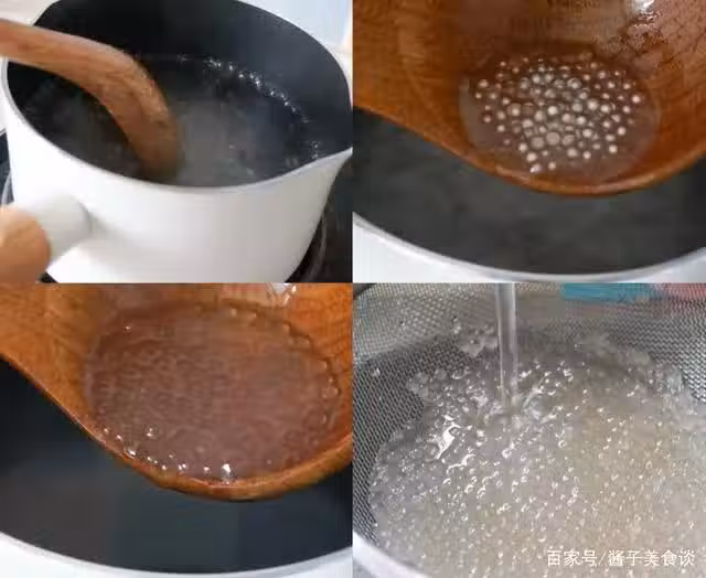 4、燜了15分鐘的西米已經完全煮透明了,用勺子撈出西米過一遍涼水,然後放進涼白開里備用,可以先放進冰箱裡面冷藏一會。