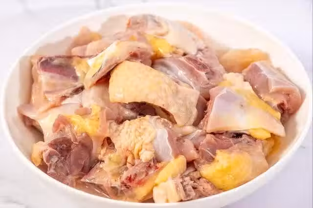 2、泡上1個小時之後,既可以雞皮上的腥味、雞肉中的血水,還可以讓肉質變得更嫩,這是需要做好的第一步。泡好之後,把雞肉放在水中清洗,沖洗乾淨表面泡出來的髒東西,瀝干水分。