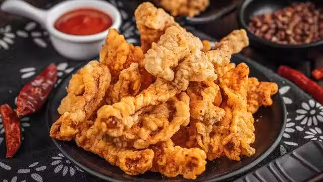 4.起鍋,加入寬油,油溫至5成熱, 把肉條一個個放入鍋中, 肉條炸定型後用勺子輕輕推動,使其均勻受熱,保持中小火炸4~5分鐘, 炸至金黃色撈出。