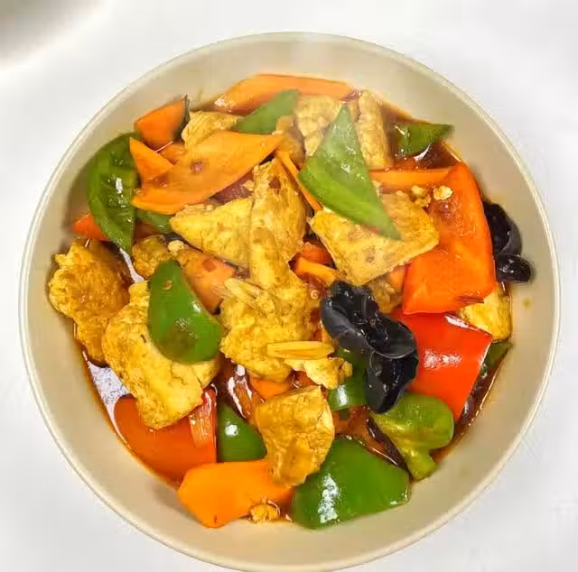 3豆腐熱油煎至兩面金黃,放入姜,蔥,蒜,小米辣炒出香味,放一勺豆瓣醬,炒出紅油