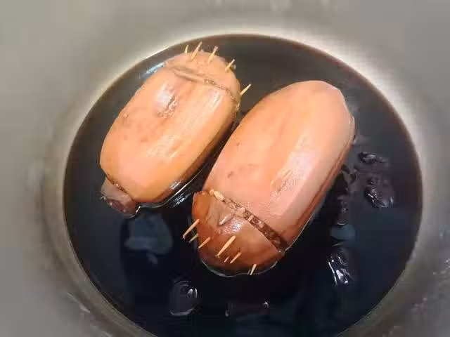 8、把泡好的蓮藕撈出,然後切成厚片裝盤,從高壓鍋水內盛出適量的湯汁,一邊煮一邊攪動直至湯汁濃稠即可。