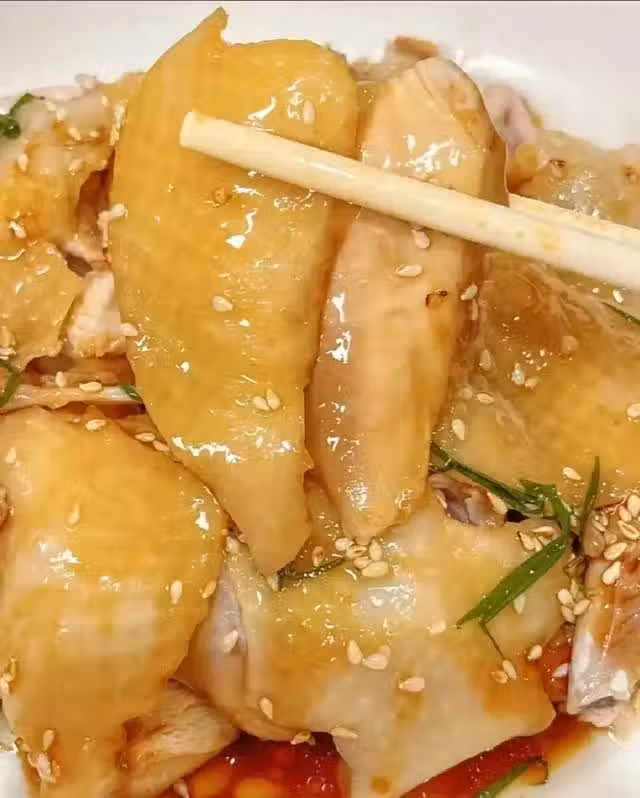 第四步,手撕雞肉擺盤,放入蔥絲白芝麻,撒上第三步的醬汁。