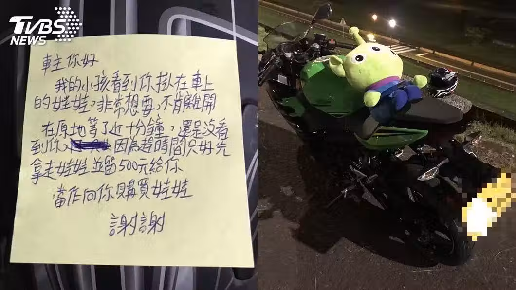 後來原PO也補充後續,表示去停車場管理處調閱監視器,畫面中有拍到拿走的人,是對年輕夫妻和約四五歲的小男孩,孩子當時在車子旁邊看娃娃許久,爸媽嘗試跟孩子溝通卻還是沒有用,最後只好留下紙條和鈔票,但因為鈔票沒夾緊掉落地上,後來才被其他人撿走