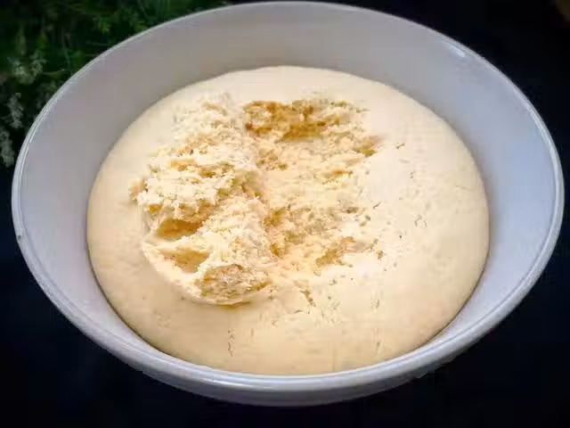5、 發酵到位的麵糰移至案板上,案板上撒麵粉防粘,麵糰大致揉幾下,搓成長條分割成劑子, 每份劑子整理成圓形再搓成兩頭尖,中間鼓鼓的棒槌形狀,蓋保鮮膜再次醒發10幾分鐘。