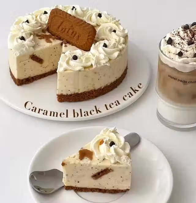 蛋糕糊:奶油奶酪 240g+細砂糖 35g+淡奶油 150g+牛奶 40g +伯爵紅茶粉 2g +吉利丁片15g+焦糖餅乾兩塊