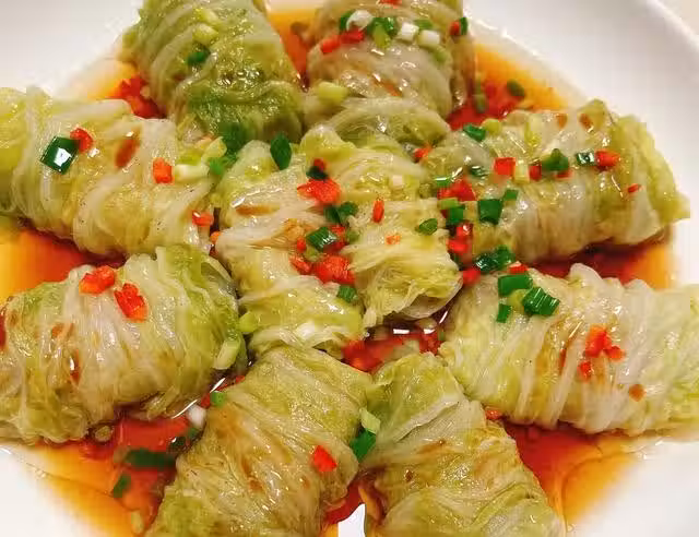 5、擺好盤的白菜卷上鍋蒸15分鐘左右(時間長短根據肉餡大小調整),蒸好的白菜卷撒上蔥花紅椒丁潑上熱油激發香味,淋上一圈蒸魚豉油