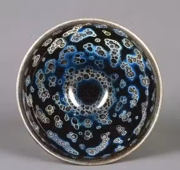 日本人用「碗中宇宙」來形容曜變天目茶碗,碗里的耀斑,就像夜空中的星辰,神秘而美麗。在光線照耀下,散發出以藍色為主的耀眼光芒,捧在手上,仿佛星辰大海就在眼前。