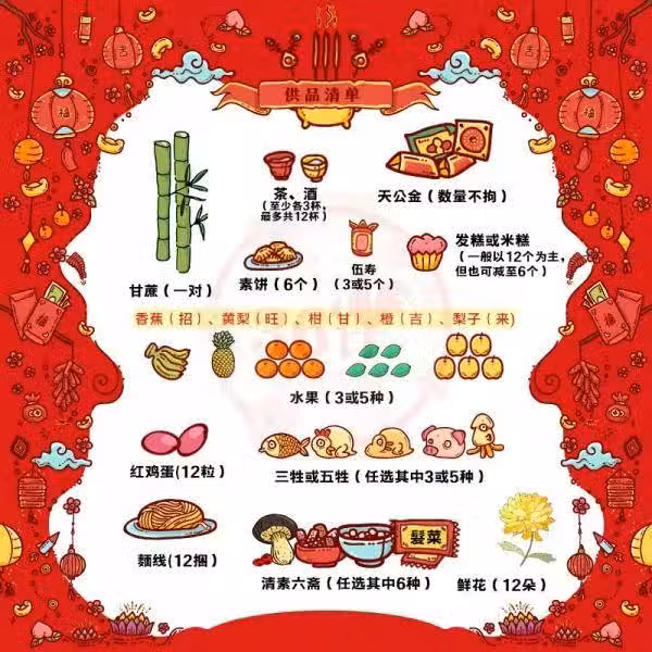 甘蔗一對、茶水、酒、素餅、發糕、香蕉、黃梨、柑、橙、梨子、紅雞蛋、面線、三牲、鮮花和素菜。