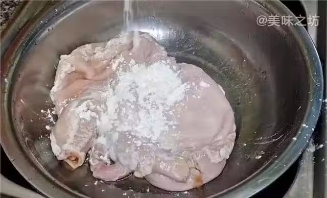 搓洗乾淨之後,把多餘的油脂剪掉。然後冷水上鍋,放入去腥三件套(蔥、姜、白酒),水開焯水兩分鐘,然後撈出來,用清水把它清洗一遍,用刀把白色部位刮乾淨。